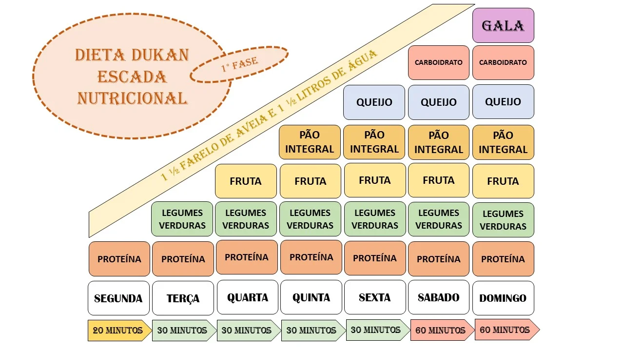 A dieta Dukan ficou famosa no mundo inteiro depois que celebridades como Penélope Cruz, Beyoncé e Sandra Bullock relataram ter perdido peso seguindo o método. Para quem não conhece a proposta é uma dieta de 4 fases, com as seguintes características: A fase 1 ou de "ataque" tem duração de 10 dias. Assemelha-se à nova dieta Atkins, na qual proteínas estão liberadas em qualquer quantidade, como carnes magras, peito de peru, frango, clara de ovo, laticínios, peixe, café e chás sem açúcar. Como diferencial está a inclusão do farelo de aveia para evitar a constipação comum em dietas restritivas. Também é recomendado o consumo diário de dois litros de líquidos.