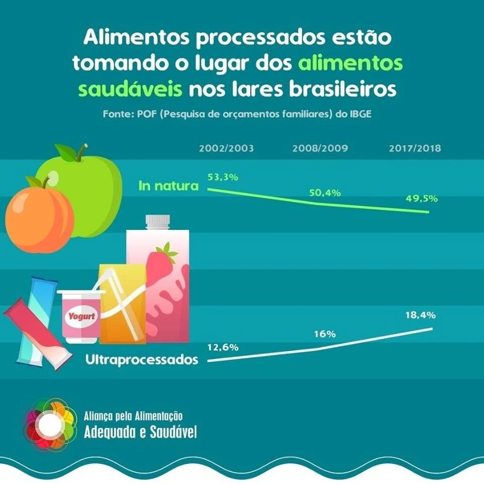 Nos últimos quinze anos, o consumo de alimentos saudáveis caiu quase que pela metade no Brasil, ao passo que os produtos ultraprocessados têm inundado o cardápio das famílias. Produtos ultraprocessados devem ser evitados, uma vez que estão diretamente relacionados a graves problemas de saúde.