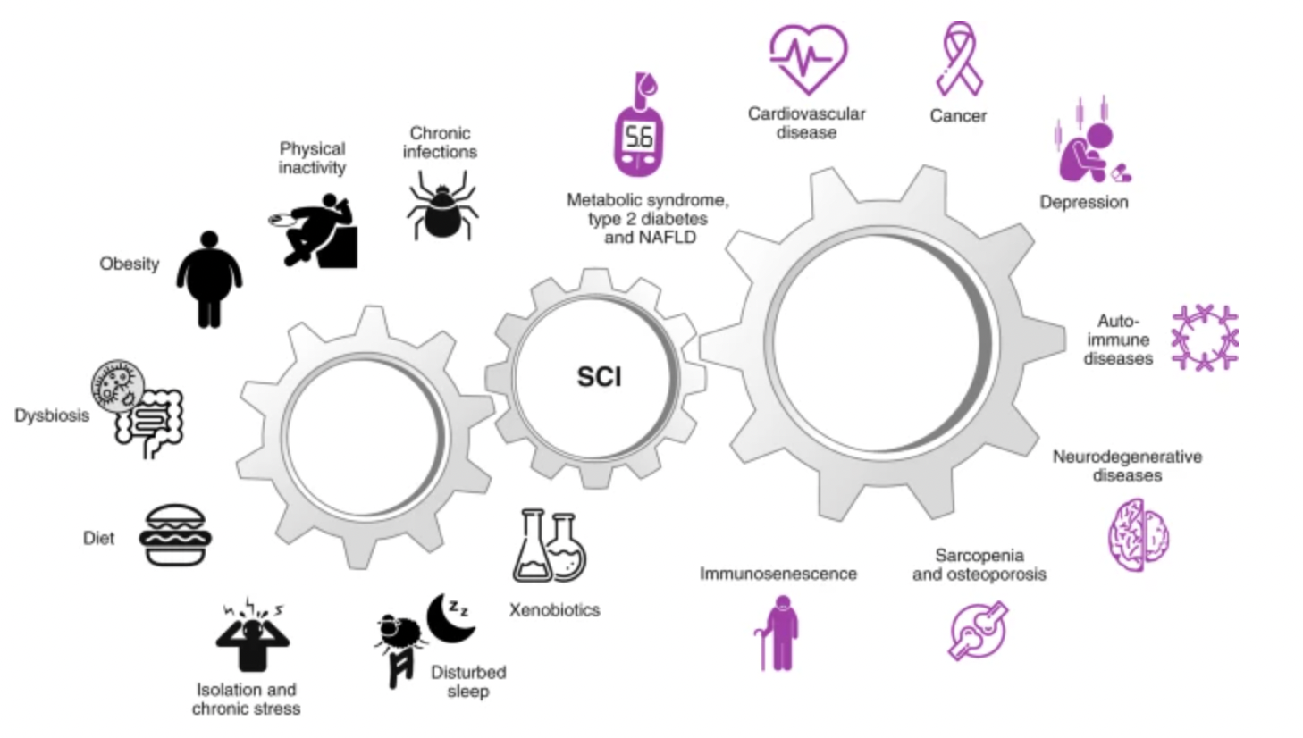 Várias causas de inflamação crônica sistêmica (ICS) de baixo grau e suas consequências foram identificadas. Conforme mostrado à esquerda (clique na figura para ampliar), os gatilhos mais comuns de ICS (no sentido anti-horário) incluem infecções crônicas, inatividade física, obesidade (visceral), disbiose intestinal, dieta, isolamento social, estresse psicológico, sono perturbado e ritmo circadiano perturbado e exposição a xenobióticos, como poluentes atmosféricos, resíduos orgânicos, produtos químicos industriais e tabagismo. Conforme mostrado à direita, as consequências da ICS (no sentido horário) incluem síndrome metabólica, diabetes tipo 2, doença hepática gordurosa não alcoólica (NAFLD), doença cardiovascular, câncer, depressão, doenças autoimunes, doenças neurodegenerativas, sarcopenia, osteoporose e imunosenescência (Furman et al., 2019).