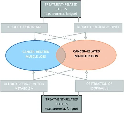Além da baixa ingestão calórica, o desenvolvimento da desnutrição é influenciado por uma série de fatores relacionados ao próprio tumor, incluindo mediadores pró-inflamatórios e fatores catabólicos derivados do tumor, bem como o potencial do tumor de obstruir ou obstruir parcialmente o esôfago e, consequentemente, afetar o consumo de alimentos e bebidas. Além disso, o próprio tratamento induz efeitos colaterais, como esofagite, anorexia e náusea, que podem afetar ainda mais a ingestão alimentar e o nível de atividade física, levando à perda de massa muscular e desnutrição.