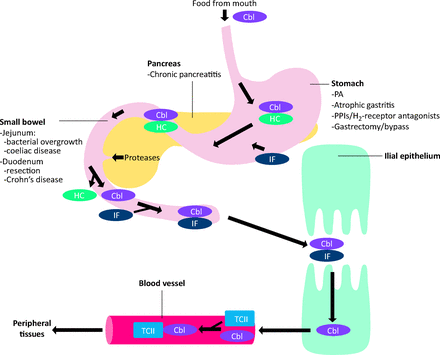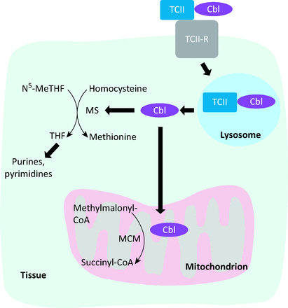 Ao atravessar a borda em escova intestinal, a vitamina B12 dissocia-se do FI e entra na circulação onde se liga à transcobalamina II ou novamente à haptocorrina. A transcobalamina II e a haptocorrina são responsáveis pela entrega de cobalamina aos tecidos periféricos e ao fígado, respectivamente. Após o transporte para os tecidos periféricos, a vitamina B12 livre é gerada e utilizada no ciclo do 1-carbono. Junto com a vitamina B9 (metilfolato), recicla homocisteína em metionina. Outra reação dependente de vitamina B12 é a conversão de metilmalonil CoA em succinil CoA pela metilmalonil CoA mutase, dentro da mitocôndria.