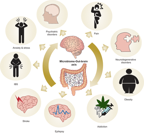 A variedade de doenças e processos de doenças nos quais a microbiota está envolvida, incluindo transtornos psiquiátricos e neurodegenerativos, dor, ansiedade, estresse, síndrome do intestino irritável (SII), derrame, compulsão e obesidade (Cryan et al., 2019)
