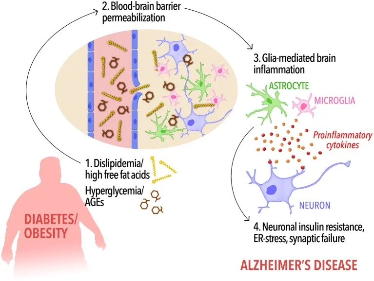 O aumento da permeabilidade da barreira hematoencefálica é ainda maior em indivíduos obesos, permitindo o influxo de ácidos graxos livres e AGEs para o cérebro, causando ativação da microglia e astrócitos e a liberação de citocinas pró-inflamatórias. Esta inflamação de baixo grau crônica do cérebro leva a eventos prejudiciais nos neurônios, incluindo resistência à insulina, preparando o cérebro para comprometimento cognitivo e doença de Alzheimer.