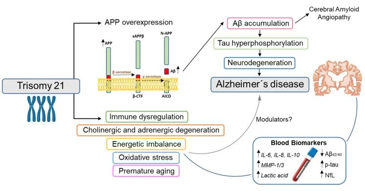 A superexpressão de genes do cromossomo 21, devido à trissomia, também contribui para desregulação imune, produção alterada de neurotransmissores colinérgicos e adrenérgicos, disfunção mitocondrial, desequilíbrios energéticos, hipometabolismo glicolítico cerebral, aumento de estresse oxidativo e envelhecimento acelerado.