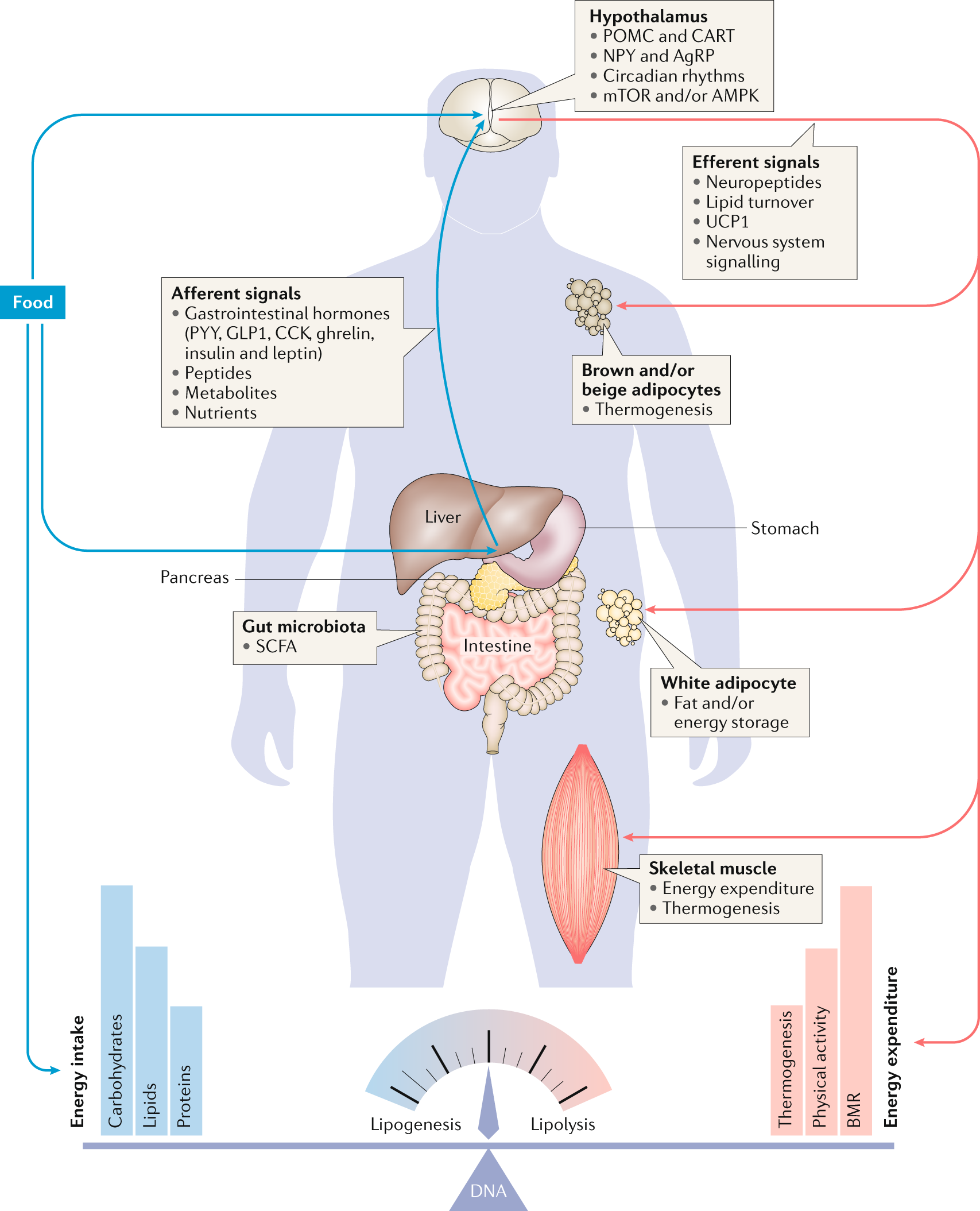 A homeostase energética está integrada em uma complexo rede intestino-microbiota-sistema endócrino-cérebro. A ingestão de alimentos induz a produção de uma série de sinais, incluindo hormônios intestinais, peptídeos, metabólitos e os nutrientes contidos nos alimentos, que afetam diferentes mecanismos no intestino e no cérebro e influenciam o gasto calórico, o apetite e o peso.