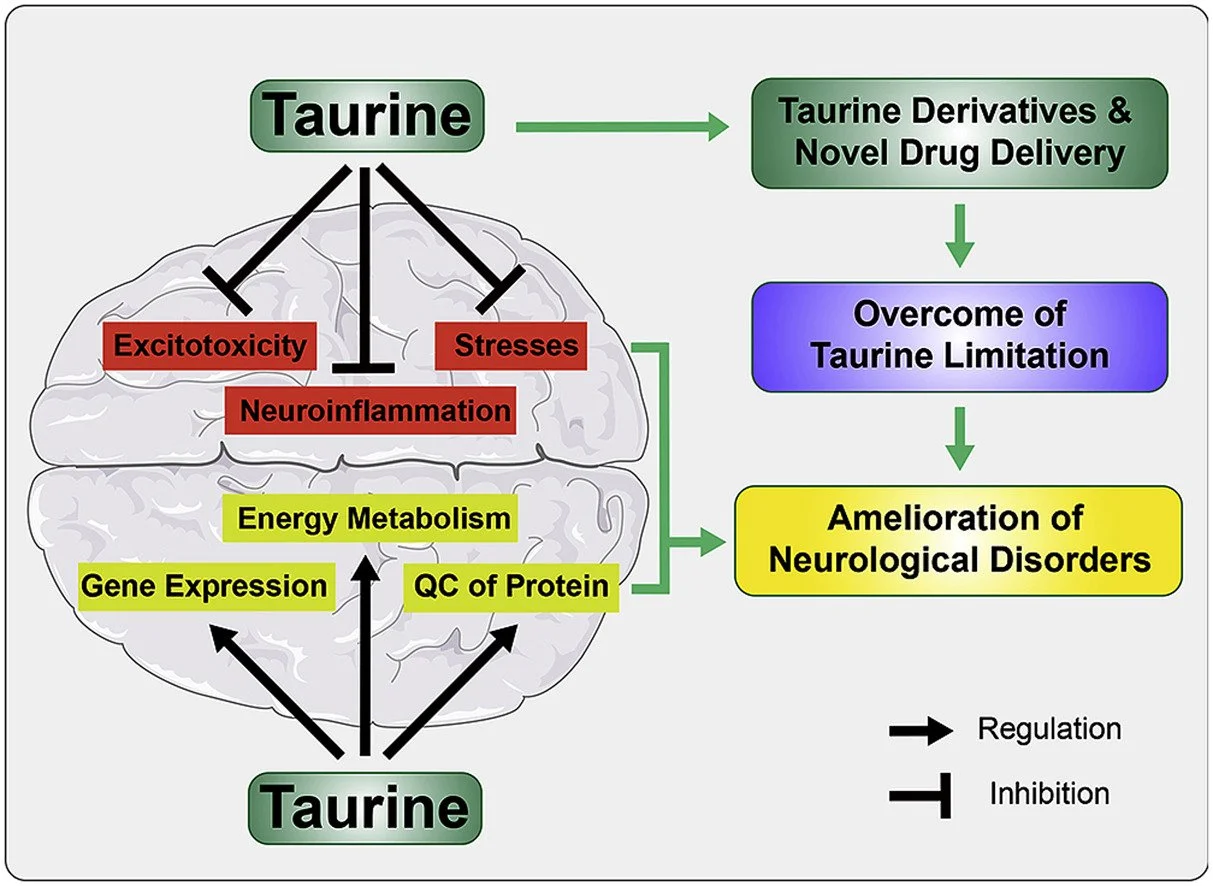 A taurina tem ação em diferentes processos celulares, como metabolismo energético, expressão gênica, osmose e controle de qualidade das proteínas. Também age melhorando diferentes distúrbios neurológicos, como doenças neurodegenerativas, acidente vascular cerebral, epilepsia e neuropatia diabética e protege contra lesões e toxicidades do sistema nervoso.