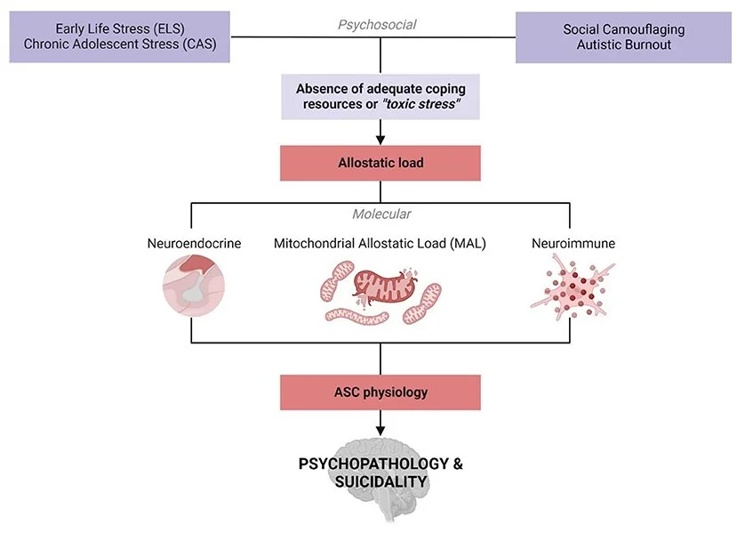 Estudos mostram que algumas crianças com Transtorno do Espectro do Autismo (TEA) a exposição crônica a estressores (maior carga alostática) pode alterar a atividade do eixo estresse (HPA), ocasionando elevações/disfunções do cortisol, alterações oxidativas/nitrosativas, modificação de fatores tróficos (BDNF) e mudanças estruturais/funcionais em regiões sensíveis ao estresse (hipocampo, amígdala, córtex pré-frontal). Essas alterações podem contribuir para pior regulação emocional, comportamento e risco somático.