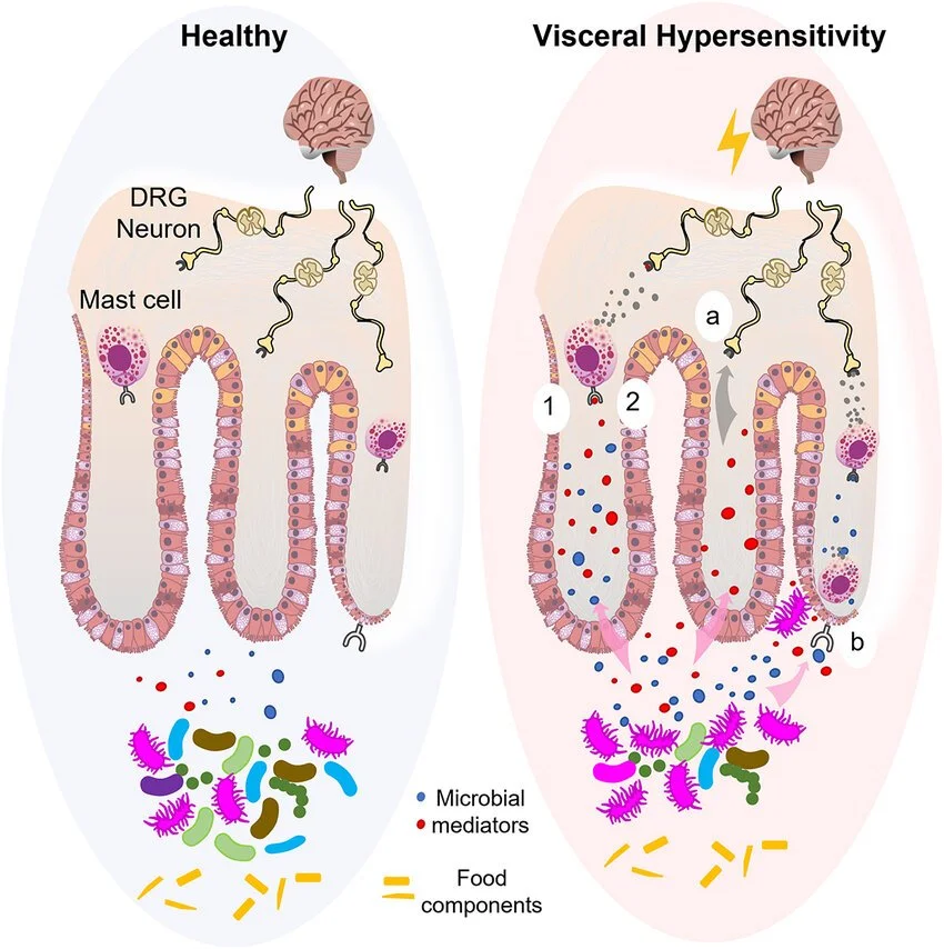 Em pacientes com hipersensibilidade visceral (por exemplo, SII), a interação entre os componentes dos alimentos e uma microbiota intestinal desequilibrada pode aumentar a atividade dos nervos nociceptivos por meio de: (1) secreção de imunomoduladores (por exemplo, histamina) ou (2) aumento da abundância de lipossacarídeos bacterianos (LPS), que, por sua vez, desencadeiam uma resposta imune do hospedeiro, como a secreção de mediadores de mastócitos (isto é, histamina, triptase e prostaglandinas), levando à ativação dos nervos nociceptivos.