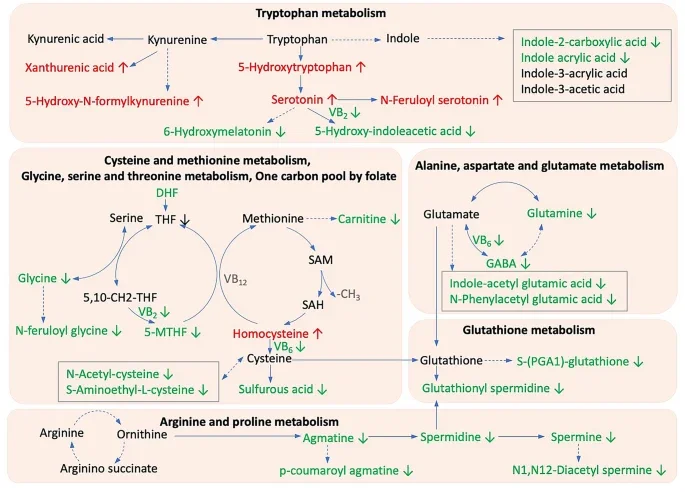 Os pesquisadores analisaram amostras fecais e encontraram alterações significativas nas vias metabólicas relacionadas a vitaminas do complexo B, ácido fólico e aminoácidos essenciais, como triptofano e metionina. Essas moléculas são fundamentais para o funcionamento cerebral, produção de neurotransmissores e regulação imunológica.