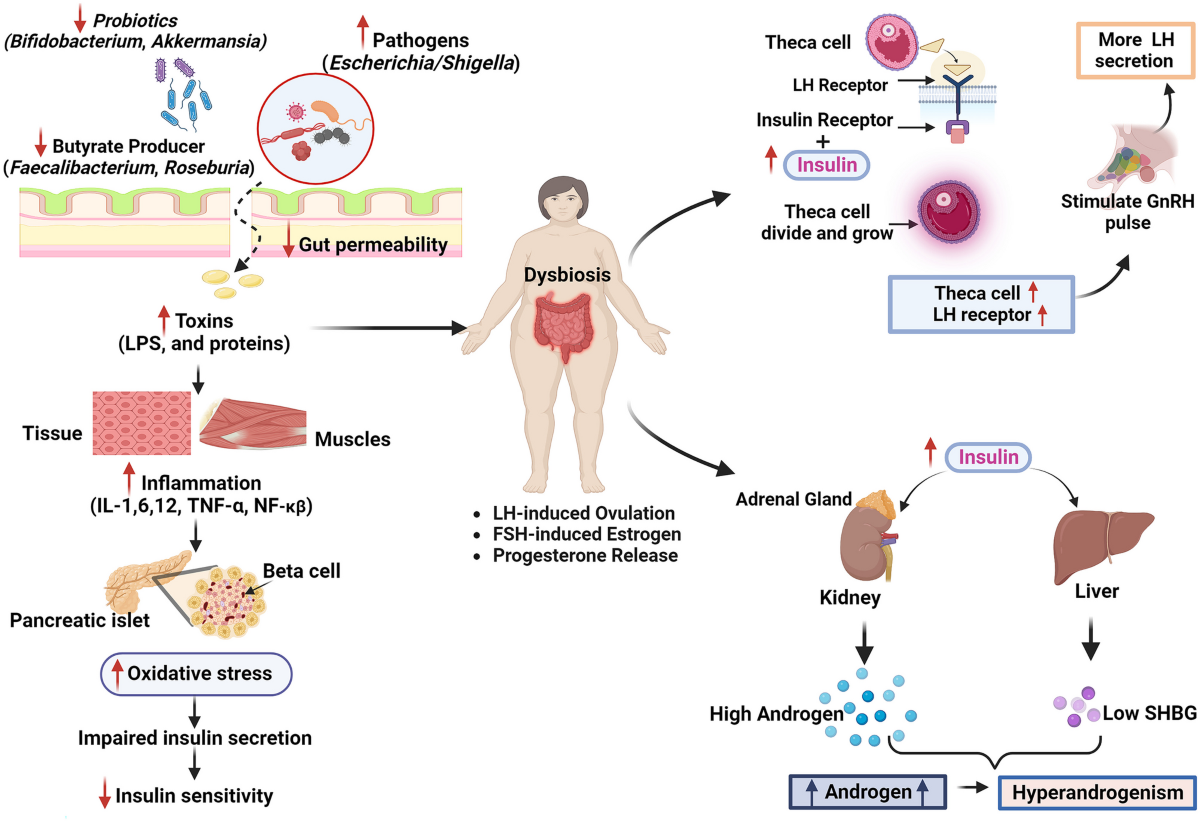 O intestino associado à SOP apresenta níveis mais elevados da enzima microbiana intestinal β-glucuronidase, causando a desglucuronidação do andrógeno conjugado, tornando-o suscetível à reabsorção pela circulação entero-hepática, levando a um nível mais alto de andrógeno no sistema circulatório.