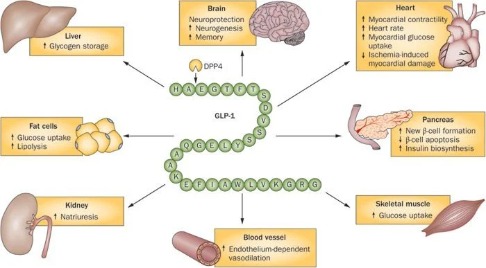 Efeitos adicionais do GLP-1 incluem retardo do esvaziamento gástrico, supressão do apetite e, potencialmente, inibição da apoptose das células β. O GLP-1 nativo é degradado em cerca de 2–3 minutos na circulação; portanto, vários agonistas do receptor de GLP-1 foram desenvolvidos para fornecer ações prolongadas in vivo.