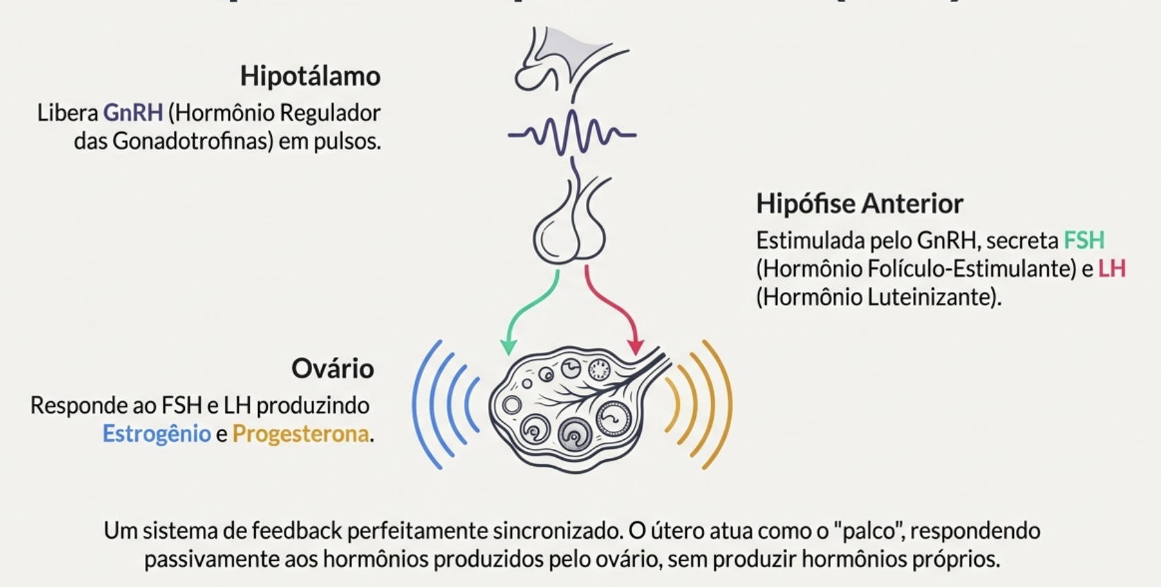O ciclo funciona como uma engrenagem envolvendo o Eixo Hipotálamo-Hipófise-Ovário. O Hipotálamo libera o hormônio GnRH de forma pulsátil. A Hipófise anterior reage ao GnRH secretando as gonadotrofinas FSH e LH. O Ovário produz estrogênio e progesterona.