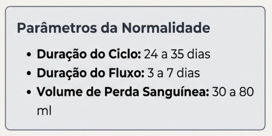 Um ciclo saudável geralmente dura entre 24 e 35 dias, com sangramento de 3 a 7 dias e volume de 30 a 80 ml.