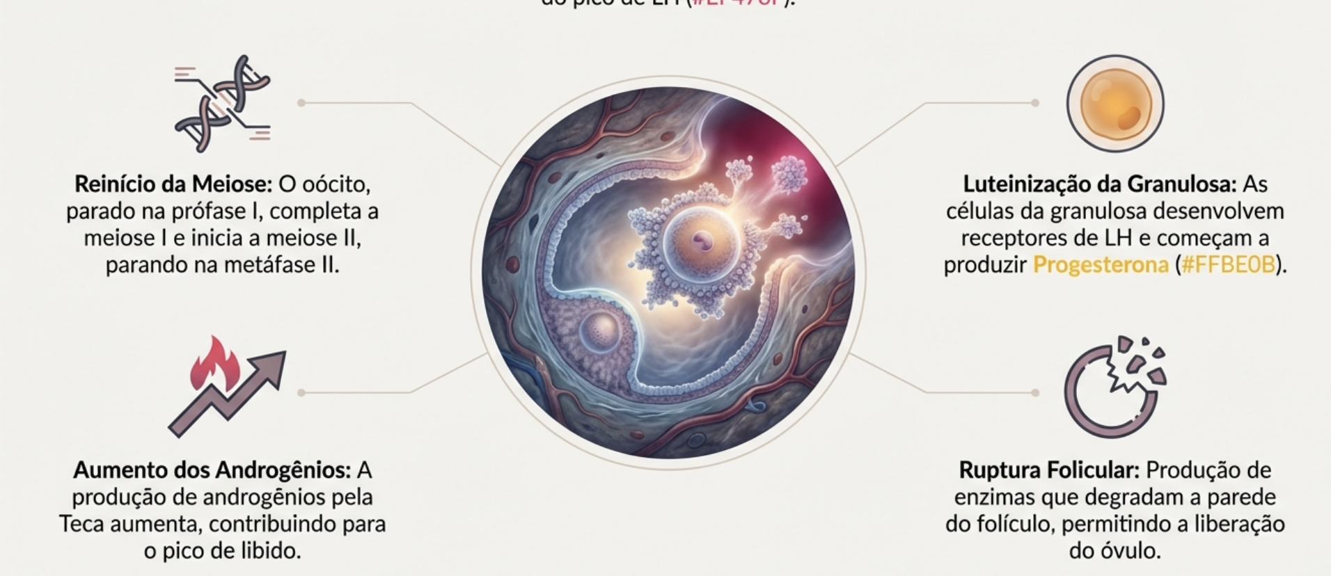 O pico de LH faz a meiose do óvulo ser retomada e causa a ovulação. O folículo vazio se transforma no corpo lúteo, que produz progesterona. A progesterona prepara o endométrio e aumenta a libido da mulher, estimulando o desejo sexual no período fértil.
