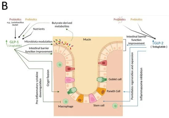 GLP-2: Fundamental para a saúde intestinal. Promove a proliferação de células das criptas, expansão das células-tronco intestinais e crescimento da mucosa, sendo vital para a absorção de nutrientes.