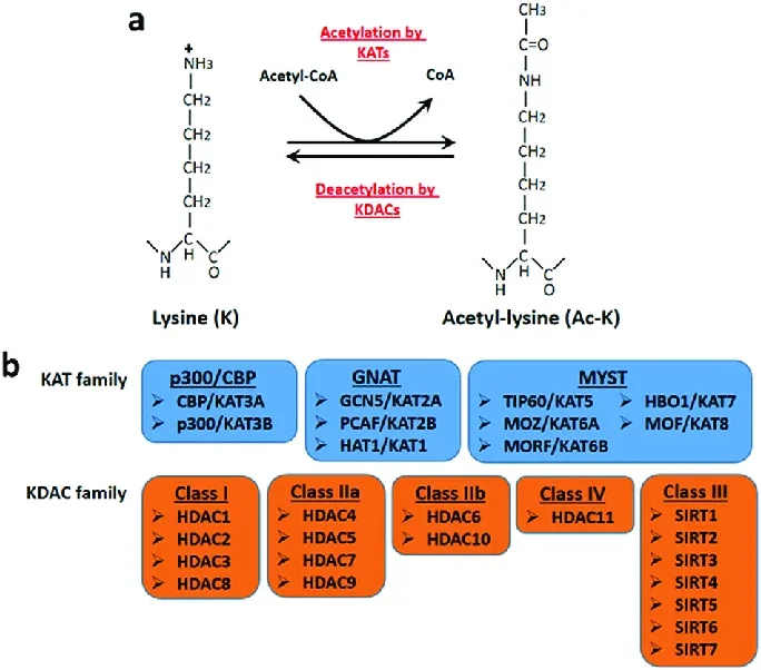 Enzimas “writers” como p300 catalisam a transferência; “erasers” (ex. HDAC1–3) removem a modificação.