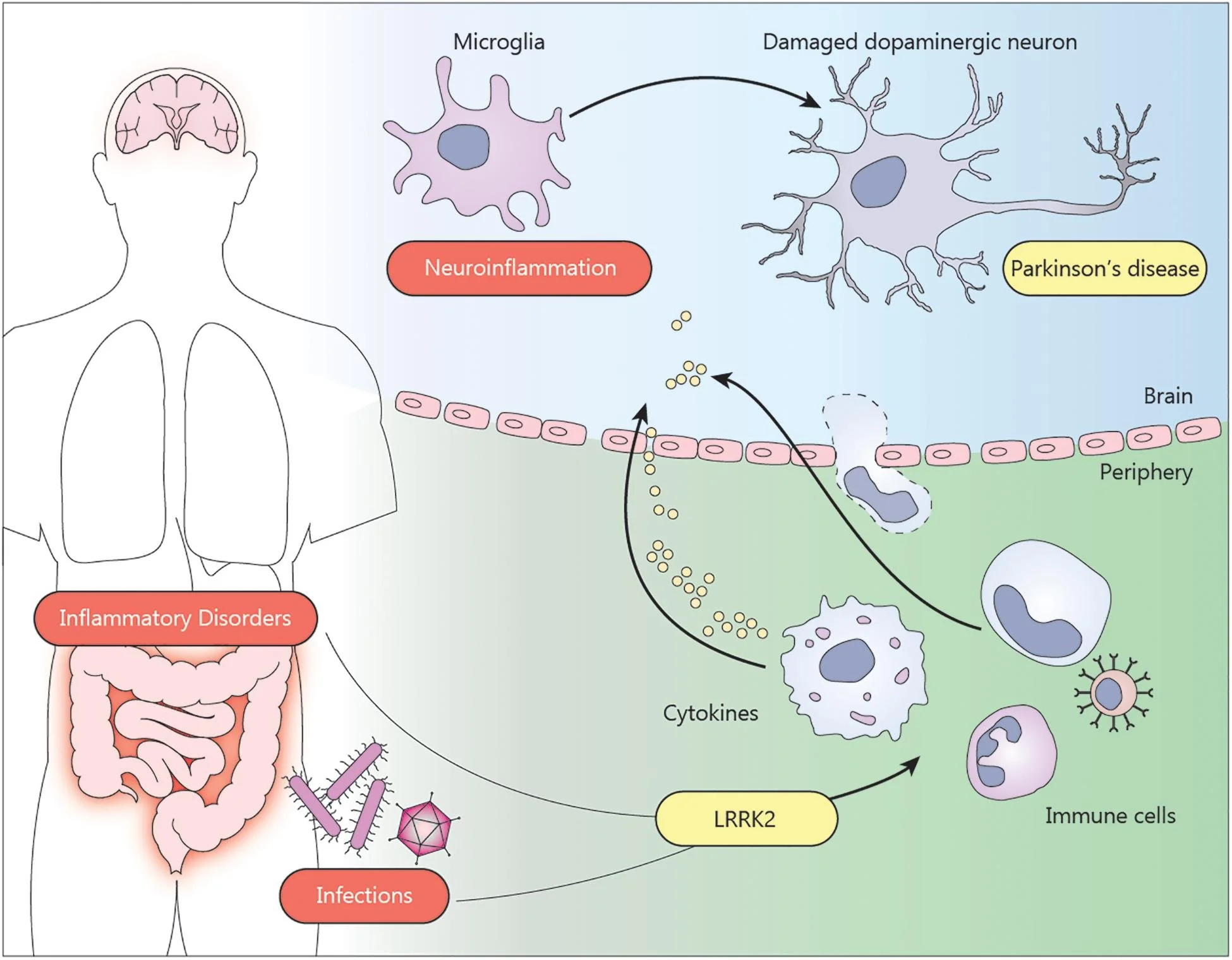 A hipótese sugere que a disbiose (desequilíbrio) da microbiota intestinal pode desencadear inflamação, o que pode promover o desenvolvimento da DP. Citocinas pró-inflamatórias, como o fator de necrose tumoral e a interleucina-1β, estão elevadas na DP, correlacionando-se com alterações na microbiota intestinal [17].