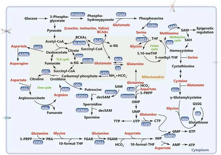 Aspartato, glutamina e glicina são indispensáveis para formar purinas e pirimidinas (IMP, GMP, UMP), os blocos de DNA e RNA. Como tumores precisam duplicar seu genoma constantemente, essa via é especialmente ativa em células malignas.